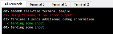 The All Terminals tab displays the complete output of RTT Channel 0 and can display the user input (Check Input -> Echo input... -> Echo to "All Terminals").\n Each output line is prefixed by the Terminal it has been sent to. Additionally, output on Terminal 1 is shown in red, output on Terminals 2 - 15 in gray.