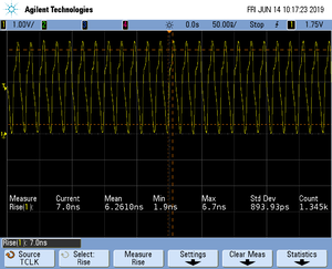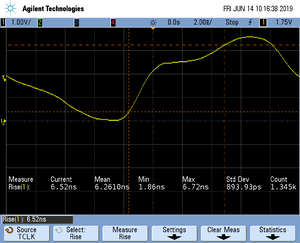The rise time of a signal shows the time needed for a signal to rise from logical 0 to logical 1. For this the values at 10% and 90% of the expected voltage level get used as markers. The following picture shows such a measurement for the trace clock signal.