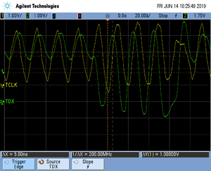 The following pictures show oscilloscope measurements of trace signals output by the "Tested Hardware" using the example project. All measurements have been performed using a Agilent InfiniiVision DSO7034B 350 MHz 2GSa/s oscilloscope and 1156A 1.5 GHz Active Probes. If your trace signals look similar on your trace hardware, chances are good that tracing will work out-of-the-box using the example project. More information about correct trace timing can be found at the following website.