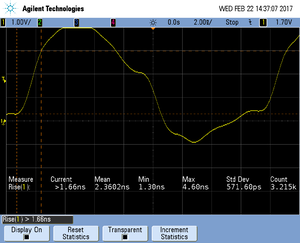 The rise time of a signal shows the time needed for a signal to rise from logical 0 to logical 1. For this the values at 10% and 90% of the expected voltage level get used as markers. The following picture shows such a measurement for the trace clock signal.