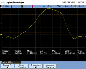 The rise time of a signal shows the time needed for a signal to rise from logical 0 to logical 1. For this the values at 10% and 90% of the expected voltage level get used as markers. The following picture shows such a measurement for the trace clock signal.