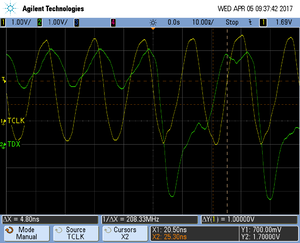 The following pictures show oscilloscope measurements of trace signals output by the "Tested Hardware" using the example project. All measurements have been performed using a Agilent InfiniiVision DSO7034B 350 MHz 2GSa/s oscilloscope and 1156A 1.5 GHz Active Probes. If your trace signals look similar on your trace hardware, chances are good that tracing will work out-of-the-box using the example project. More information about correct trace timing can be found at the following website.