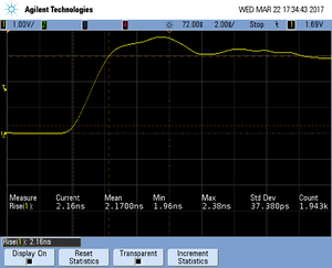 The rise time of a signal shows the time needed for a signal to rise from logical 0 to logical 1. For this the values at 10% and 90% of the expected voltage level get used as markers. The following picture shows such a measurement for the trace clock signal.