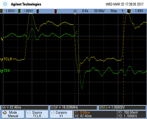 The following pictures show oscilloscope measurements of trace signals output by the "Tested Hardware" using the example project. All measurements have been performed using a Agilent InfiniiVision DSO7034B 350 MHz 2GSa/s oscilloscope and 1156A 1.5 GHz Active Probes. If your trace signals look similar on your trace hardware, chances are good that tracing will work out-of-the-box using the example project. More information about correct trace timing can be found at the following website.
