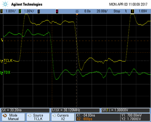 The following pictures show oscilloscope measurements of trace signals output by the "Tested Hardware" using the example project. All measurements have been performed using a Agilent InfiniiVision DSO7034B 350 MHz 2GSa/s oscilloscope and 1156A 1.5 GHz Active Probes. If your trace signals look similar on your trace hardware, chances are good that tracing will work out-of-the-box using the example project. More information about correct trace timing can be found at the following website.